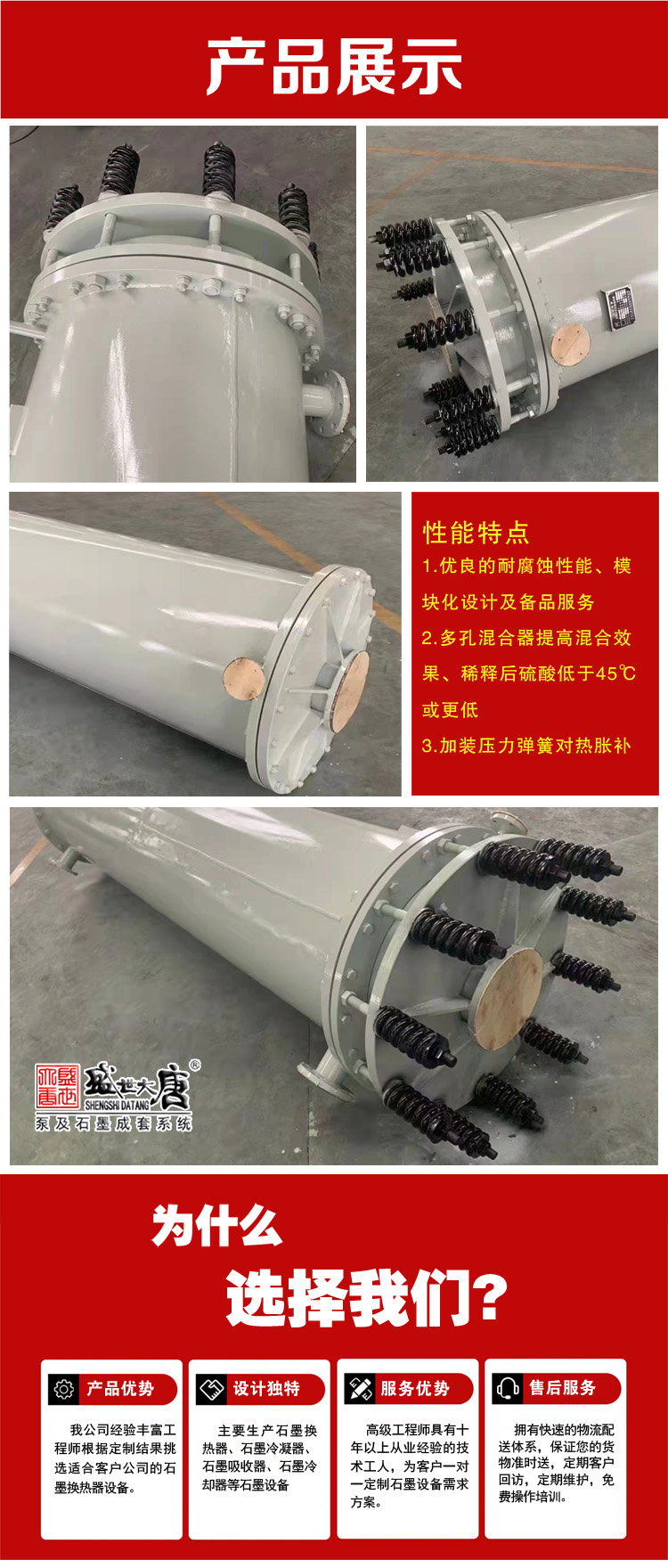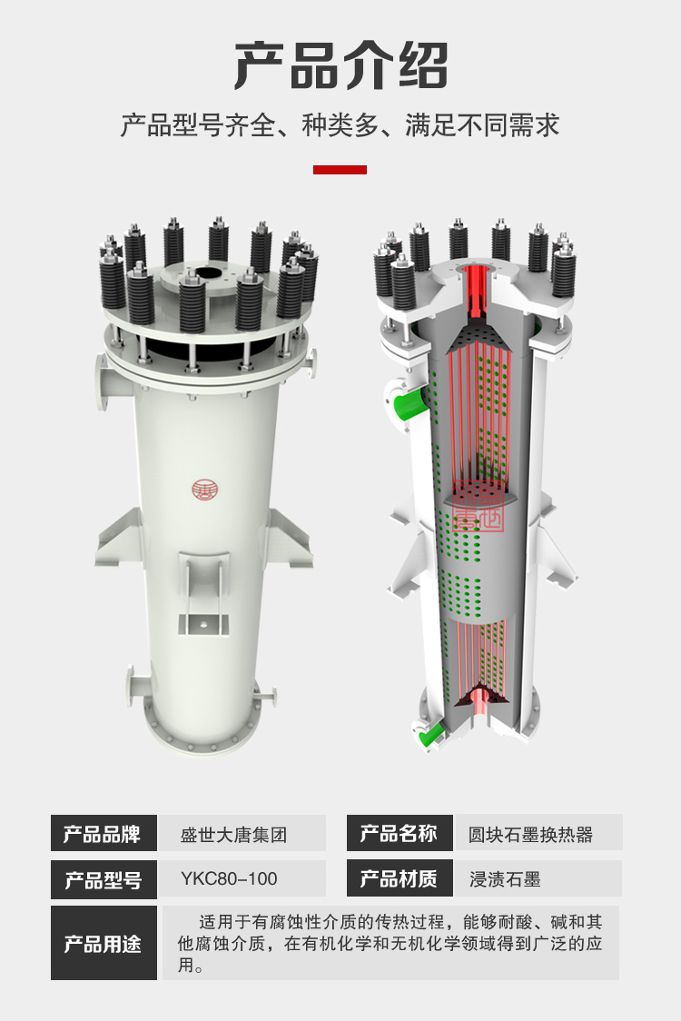 1.根據工藝物料的不同,管程與殼程均可為腐蝕性物料2.選用不同的浸漬劑浸漬石墨,承受不同的工藝物料3. 具有良好的傳熱系數及膨脹系數